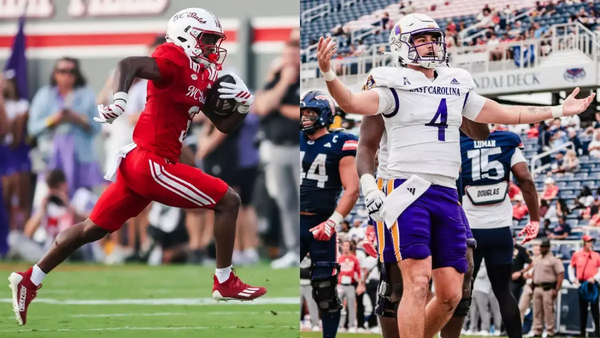 Hollywood Smothers (NC State) and Katin Houser (East Carolina) are two of the most prominent North Carolina college football names set to enter the transfer portal. Photos courtesy NCSU, ECU athletics.